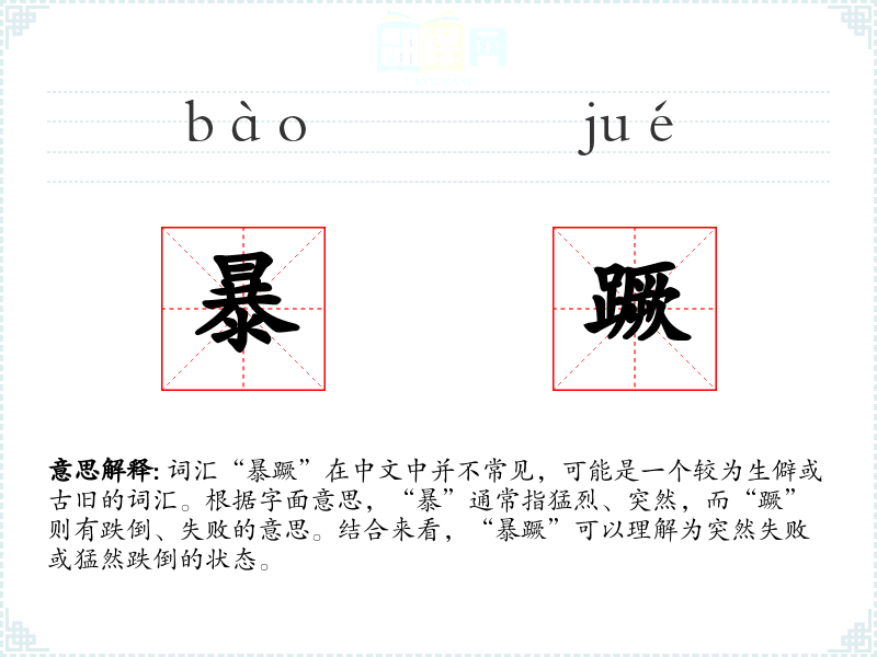 词汇“暴蹶”在中文中并不常见,可能是一个较为生僻或古旧的词汇。根据字面意思,“暴”通常指猛烈、突然,而“蹶”则有跌倒、失败的意思。结合来看,“暴蹶”可以理解为突然失败或猛然跌倒的状态。