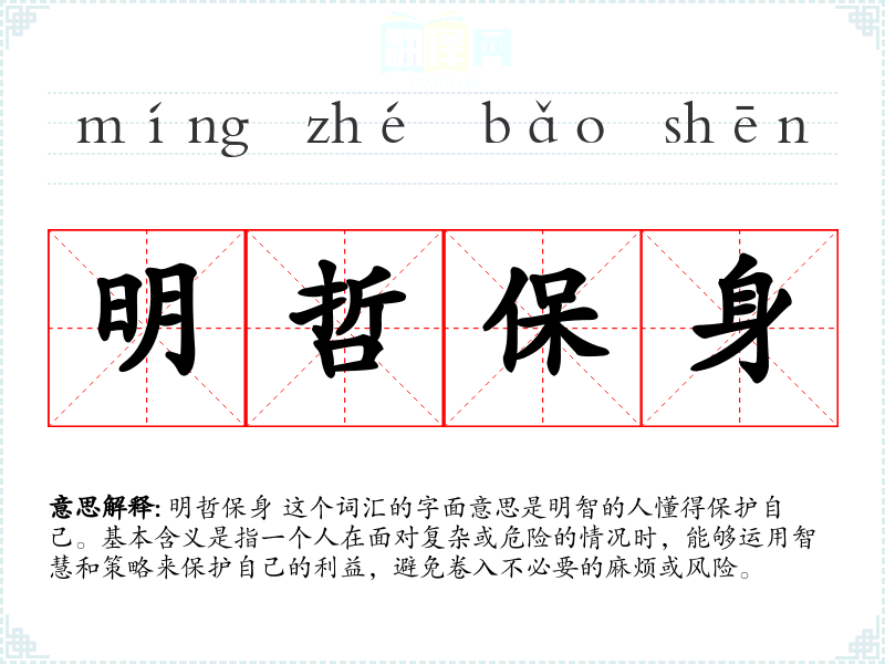 明哲保身 这个词汇的字面意思是明智的人懂得保护自己。基本含义是指一个人在面对复杂或危险的情况时,能够运用智慧和策略来保护自己的利益,避免卷入不必要的麻烦或风险。