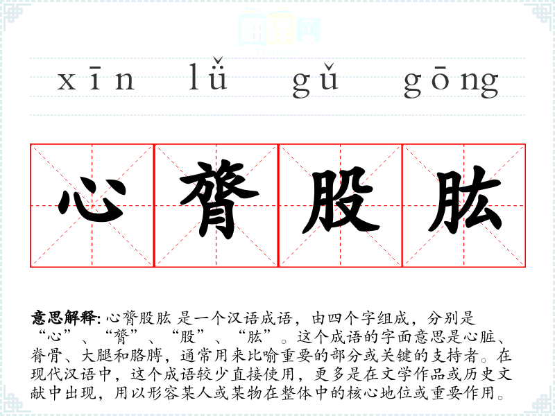 心膂股肱 是一个汉语成语,由四个字组成,分别是“心”、“膂”、“股”、“肱”。这个成语的字面意思是心脏、脊骨、大腿和胳膊,通常用来比喻重要的部分或关键的支持者。在现代汉语中,这个成语较少直接使用,更多是在文学作品或历史文献中出现,用以形容某人或某物在整体中的核心地位或重要作用。