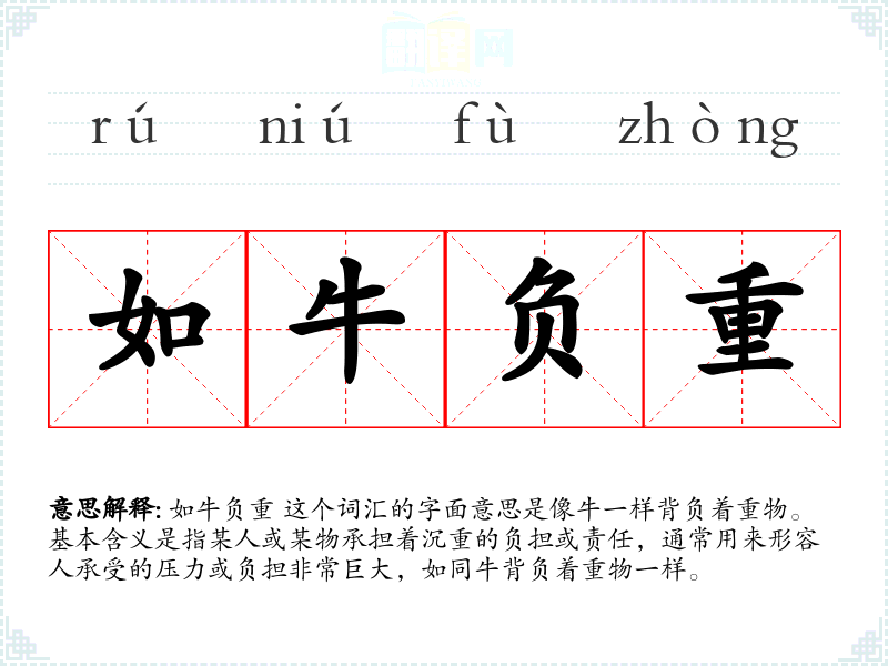 如牛负重 这个词汇的字面意思是像牛一样背负着重物。基本含义是指某人或某物承担着沉重的负担或责任,通常用来形容人承受的压力或负担非常巨大,如同牛背负着重物一样。