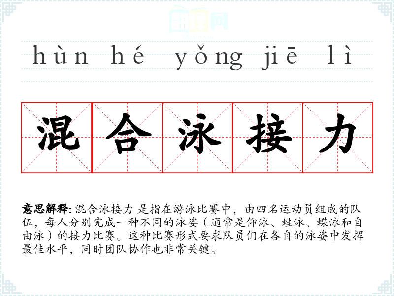 混合泳接力 这个词是由“混合”和“泳接力”两个词组合而成。随着游泳**的发展,这种结合多种泳姿的接力形式逐渐成为一项正式的比赛项目。