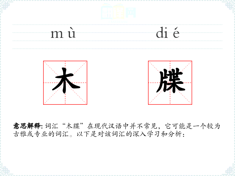 词汇“木牒”在现代汉语中并不常见,它可能是一个较为古雅或专业的词汇。以下是对该词汇的深入学*和分析: