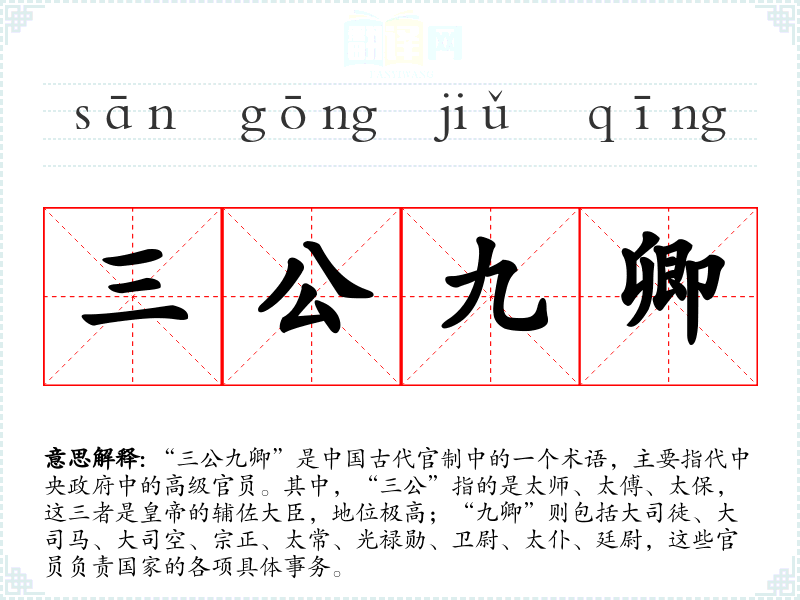 “三公九卿”这个词汇不仅是古代官制的一个重要组成部分,也是理解古代政治和社会结构的关键。通过对这个词汇的学*,我更加深入地理解了**古代的历史和文化。