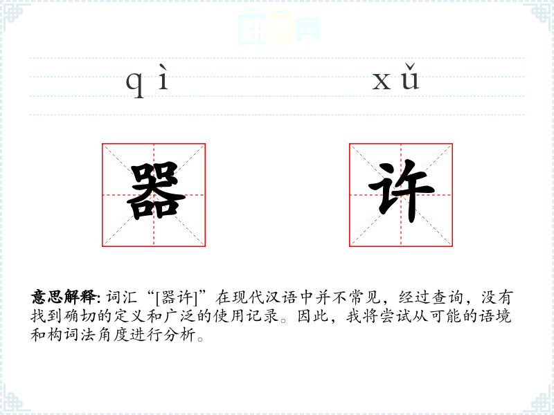 综上所述,词汇“[器许]”在现代汉语中并不存在,因此无法进行深入的学习和分析。如果这是一个特定领域的术语或方言词汇,可能需要更具体的语境和资料来进行分析。