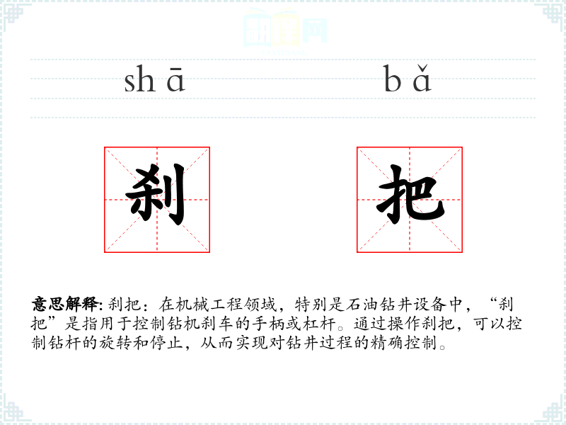 刹把:在机械工程领域,特别是石油钻井设备中,“刹把”是指用于控制钻机刹车的手柄或杠杆。通过操作刹把,可以控制钻杆的旋转和停止,从而实现对钻井过程的精确控制。