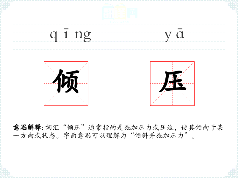 词汇“倾压”通常指的是施加压力或压迫,使其倾向于某一方向或状态。字面意思可以理解为“倾斜并施加压力”。
