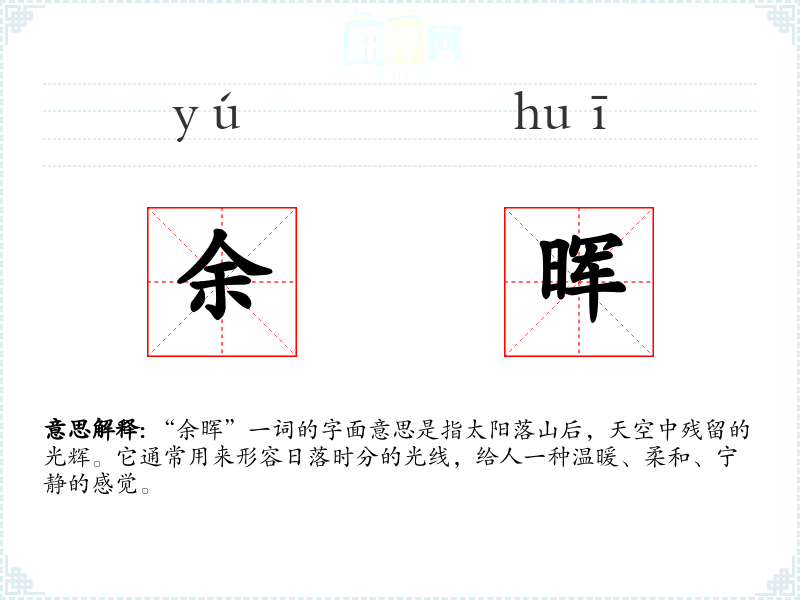 “余晖”一词的字面意思是指太阳落山后,天空中残留的光辉。它通常用来形容日落时分的光线,给人一种温暖、柔和、宁静的感觉。