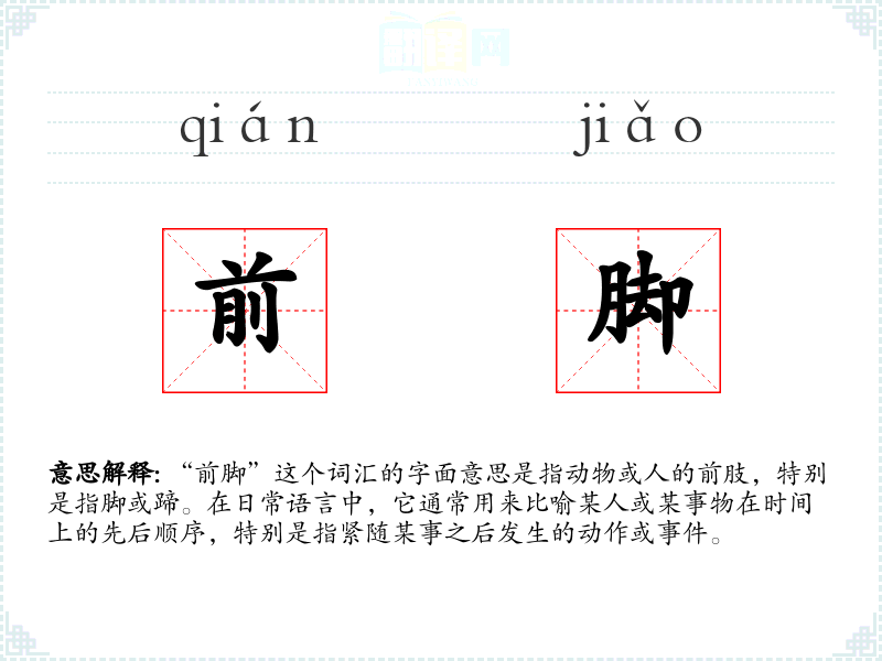 “前脚”这个词汇的字面意思是指动物或人的前肢,特别是指脚或蹄。在日常语言中,它通常用来比喻某人或某事物在时间上的先后顺序,特别是指紧随某事之后发生的动作或**。