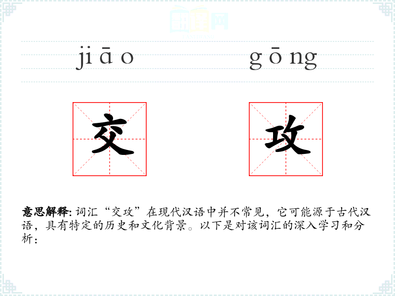 词汇“交攻”在现代汉语中并不常见,它可能源于古代汉语,具有特定的历史和文化背景。以下是对该词汇的深入学*和分析: