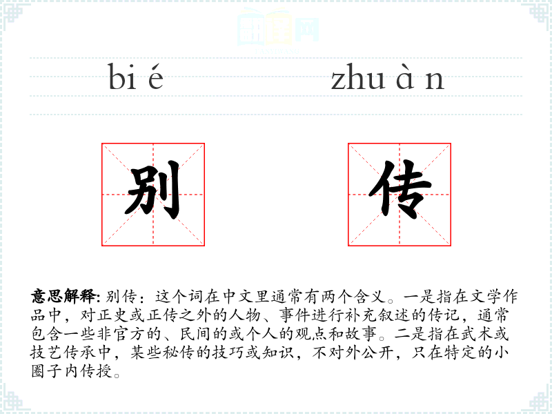 在文学领域,“别传”常用于指那些补充正史或正传的作品,如《三国志别传》。在口语中,这个词可能不太常用,但在武术界或某些技艺传承中,“别传”则是一个重要的概念,指的是那些不公开的、秘传的技艺。