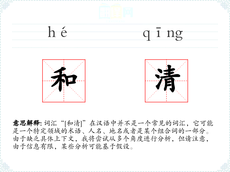 由于“和清”不是一个标准词汇,我们无法给出确切的基本定义。它可能是由“和”与“清”两个字组合而成的,其中“和”可以表示和谐、和平、和解等含义,而“清”可以表示清洁、清晰、清澈等含义。