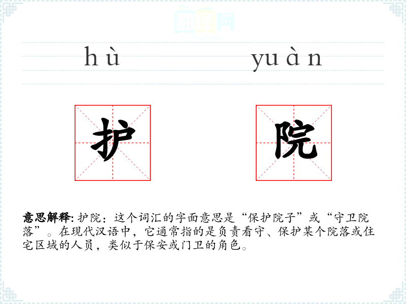 护院:这个词汇的字面意思是“保护院子”或“守卫院落”。在现代汉语中,它通常指的是负责看守、保护某个院落或住宅区域的人员,类似于保安或门卫的角色。