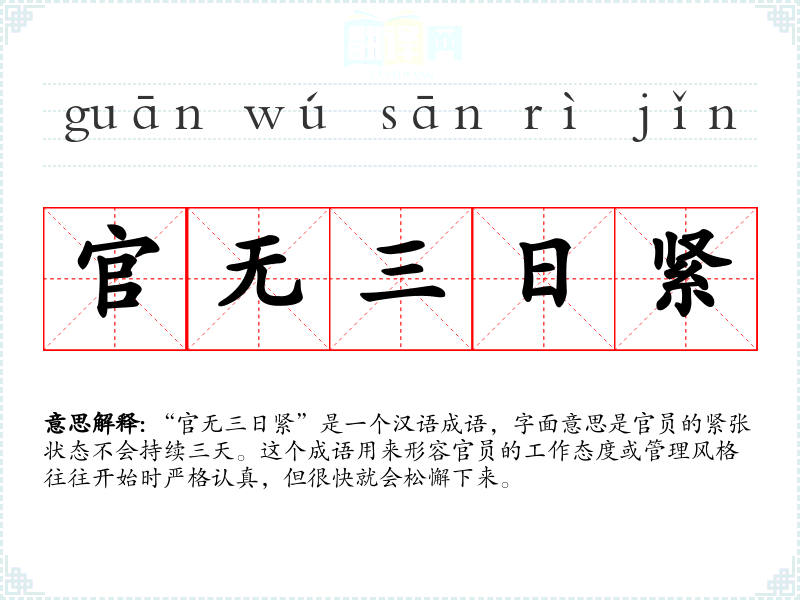 “官无三日紧”是一个汉语成语,字面意思是官员的紧张状态不会持续三天。这个成语用来形容官员的工作态度或管理风格往往开始时严格认真,但很快就会松懈下来。