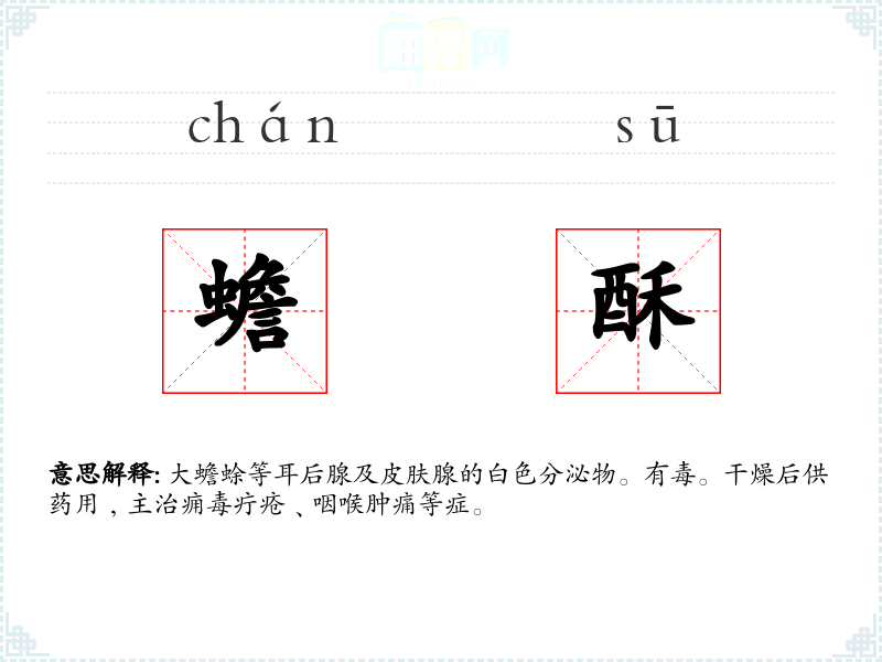 大蟾蜍等耳后腺及皮肤腺的白色分泌物。有毒。干燥后供药用﹐主治痈毒疔疮﹑咽喉肿痛等症。