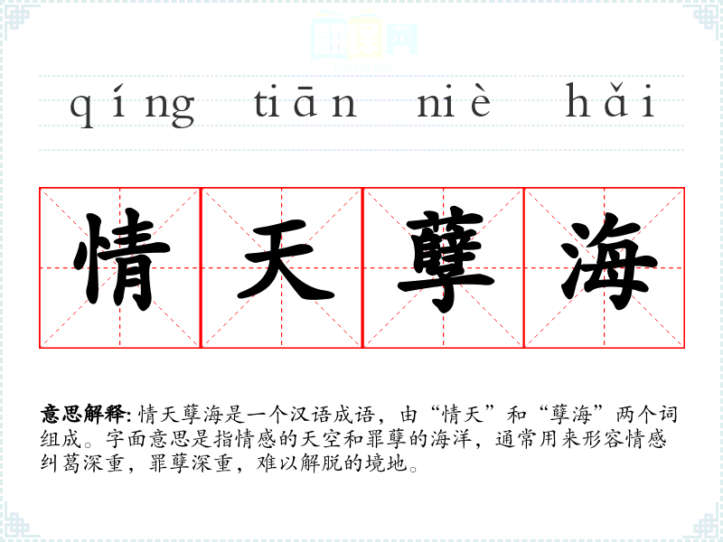 情天孽海是一个汉语成语,由“情天”和“孽海”两个词组成。字面意思是指情感的天空和罪孽的海洋,通常用来形容情感纠葛深重,罪孽深重,难以解脱的境地。