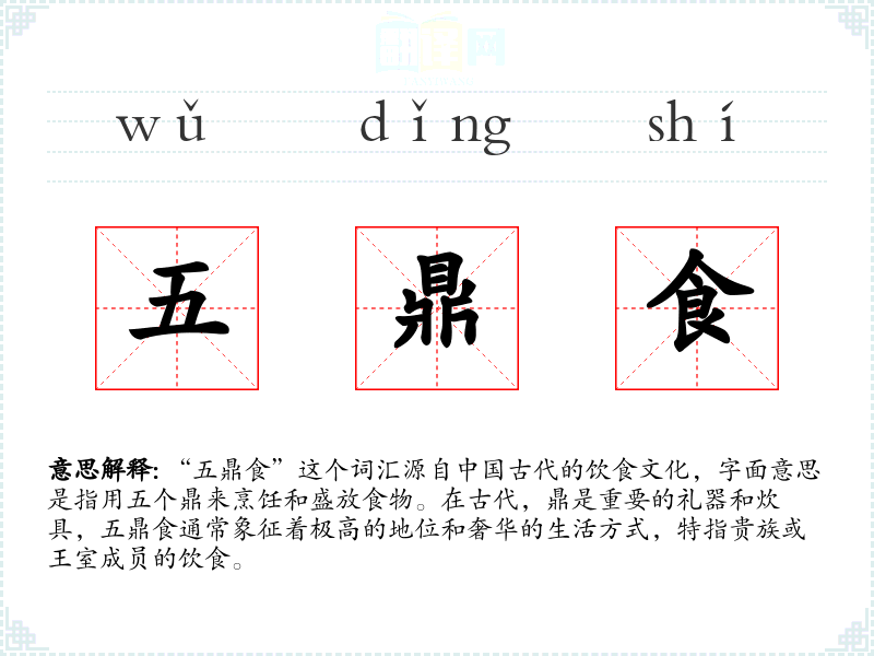 - 专业领域:在历史学或考古学领域,“五鼎食”可能被用来讨论古代社会的等级制度和饮食文化。