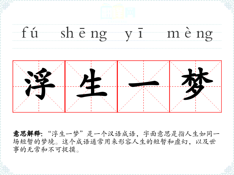“浮生一梦”是一个汉语成语,字面意思是指人生如同一场短暂的梦境。这个成语通常用来形容人生的短暂和虚幻,以及世事的无常和不可捉摸。