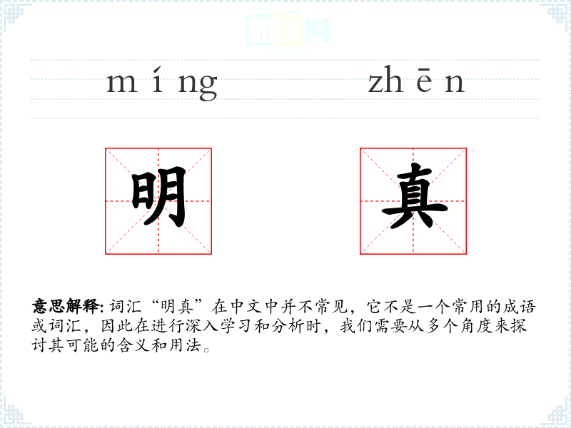 由于“明真”不是一个常用词汇,其词源和演变不太明确。但可以推测,它是由两个常用汉字组合而成,每个字都有其悠久的历史和丰富的含义。