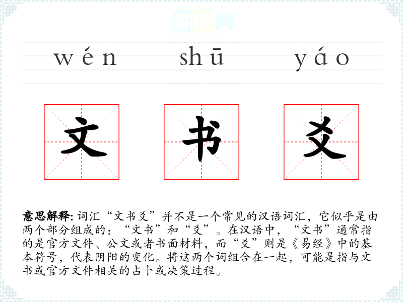 - 词源:“文书”源自古代官方文件的称呼,“爻”源自《易经》。