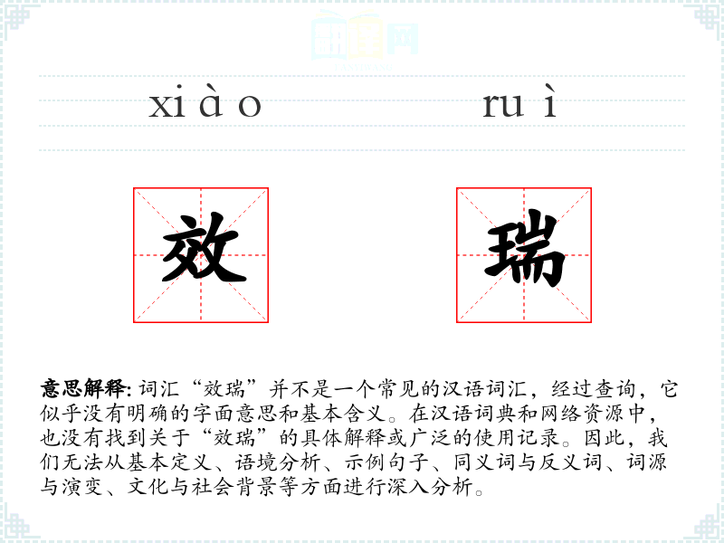 词汇“效瑞”并不是一个常见的汉语词汇,经过查询,它似乎没有明确的字面意思和基本含义。在汉语词典和网络资源中,也没有找到关于“效瑞”的具体解释或广泛的使用记录。因此,我们无法从基本定义、语境分析、示例句子、同义词与反义词、词源与演变、文化与社会背景等方面进行深入分析。