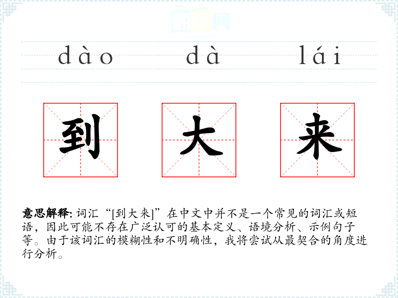 由于“[到大来]”不是一个标准词汇,我们无法提供一个确切的基本定义。它可能是某个方言、俚语或特定社群中的用语,但没有广泛的语言学资料支持其定义。