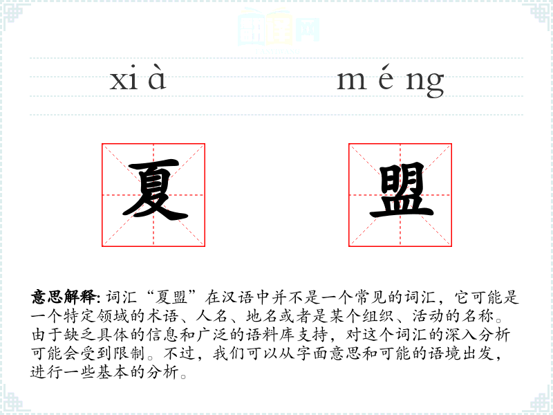 词汇“夏盟”在汉语中并不是一个常见的词汇,它可能是一个特定领域的术语、人名、地名或者是某个组织、活动的名称。由于缺乏具体的信息和广泛的语料库支持,对这个词汇的深入分析可能会受到限制。不过,我们可以从字面意思和可能的语境出发,进行一些基本的分析。