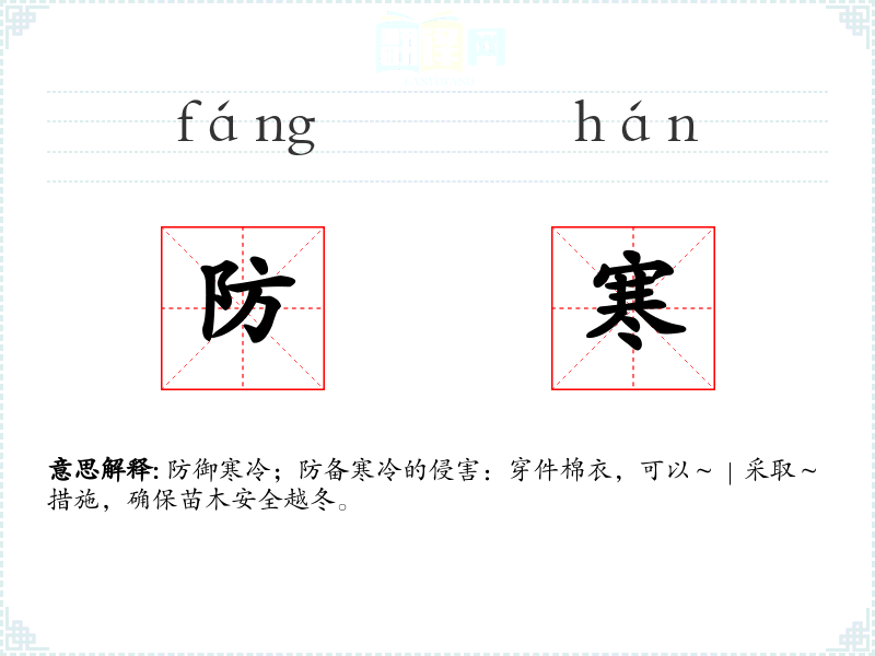 防御寒冷;防备寒冷的侵害:穿件棉衣,可以~|采取~措施,确保苗木安全越冬。