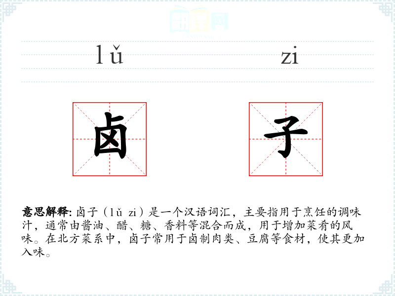 - 文学:在文学作品中,卤子可能被用来描述食物的香味或烹饪过程,如“厨房里弥漫着卤子的香气”。