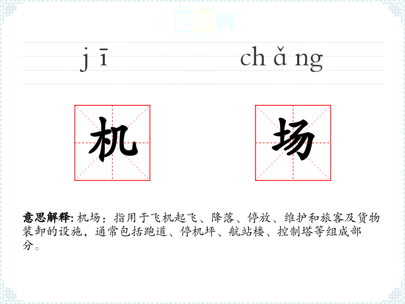 - 词源:“机场”一词源于英语“airport”,由“air”(空气)和“port”(港口)组合而成。