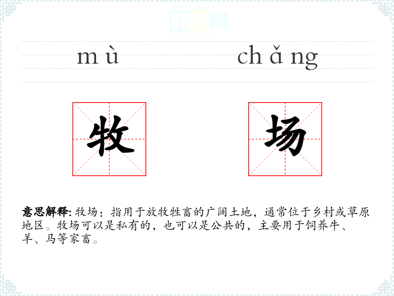 牧场:指用于放牧牲畜的广阔土地,通常位于乡村或草原地区。牧场可以是私有的,也可以是公共的,主要用于饲养牛、羊、马等家畜。