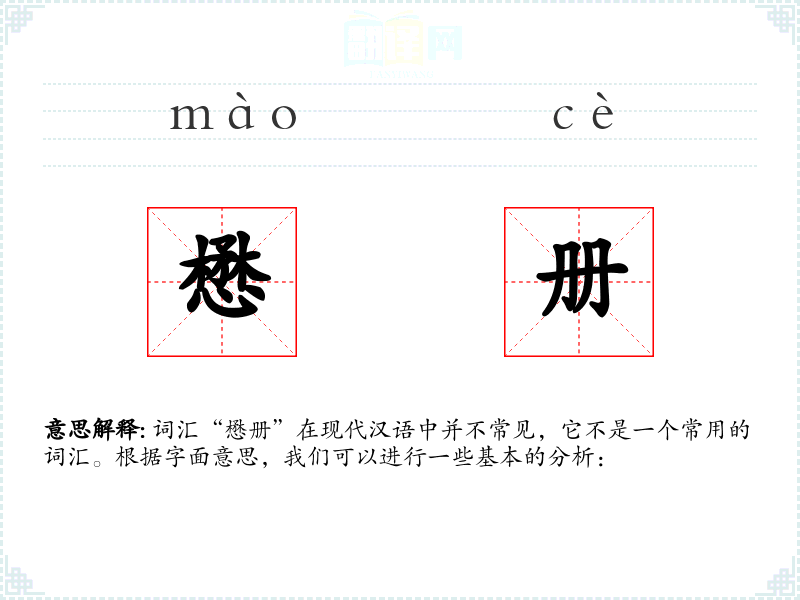 词汇“懋册”在现代汉语中并不常见,它不是一个常用的词汇。根据字面意思,我们可以进行一些基本的分析: