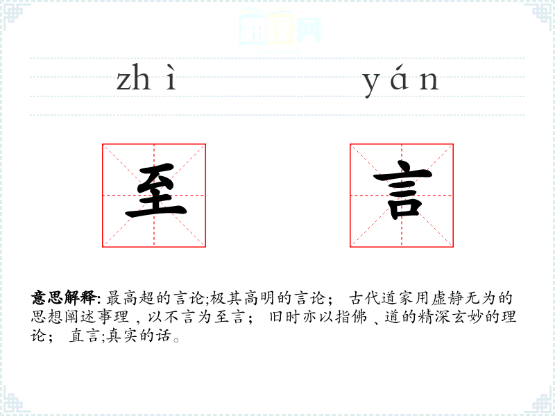 最高超的言论;极其高明的言论; 古代道家用虚静无为的思想阐述事理﹐以不言为至言; 旧时亦以指佛﹑道的精深玄妙的理论; 直言;真实的话。