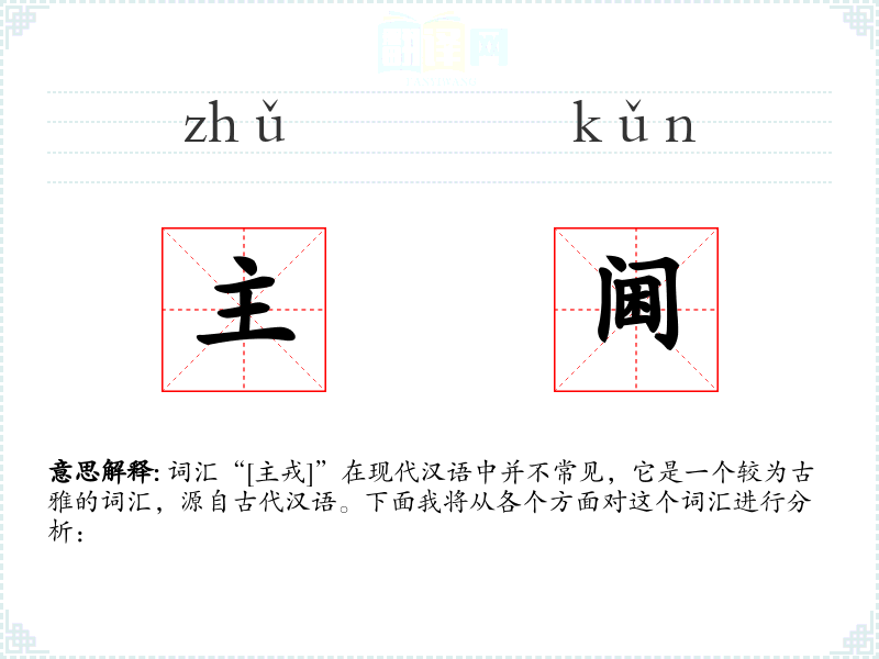 词汇“[主戎]”在现代汉语中并不常见,它是一个较为古雅的词汇,源自古代汉语。下面我将从各个方面对这个词汇进行分析: