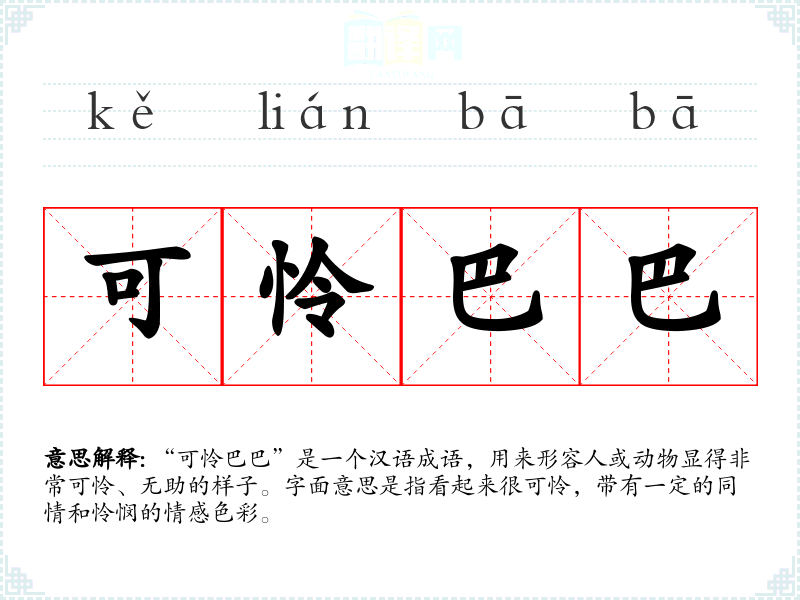 “可怜巴巴”是一个汉语成语,用来形容人或动物显得非常可怜、无助的样子。字面意思是指看起来很可怜,带有一定的同情和怜悯的情感色彩。