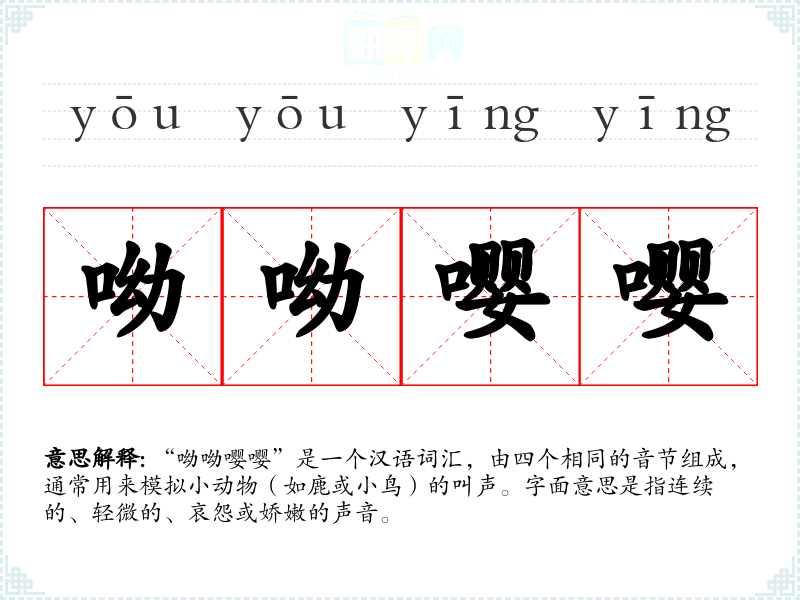 “呦呦嘤嘤”是一个汉语词汇,由四个相同的音节组成,通常用来模拟小动物(如鹿或**)的叫声。字面意思是指连续的、轻微的、哀怨或娇嫩的声音。