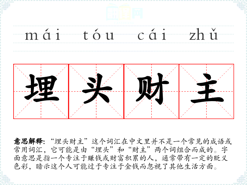 “埋头财主”这个词汇在中文里并不是一个常见的成语或常用词汇,它可能是由“埋头”和“财主”两个词组合而成的。字面意思是指一个专注于赚钱或财富积累的人,通常带有一定的贬义色彩,暗示这个人可能过于专注于金钱而忽视了其他生活方面。