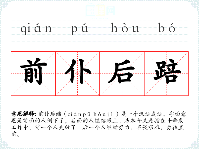 前仆后继(qián pū hòu jì)是一个汉语成语,字面意思是前面的人倒下了,后面的人继续跟上。基本含义是指在斗争或工作中,前一个人失败了,后一个人继续努力,不畏艰难,勇往直前。