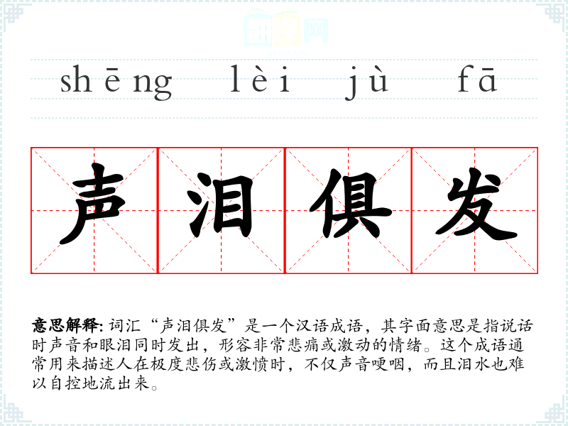 词汇“声泪俱发”是一个汉语成语,其字面意思是指说话时声音和眼泪同时发出,形容非常悲痛或激动的情绪。这个成语通常用来描述人在极度悲伤或激愤时,不仅声音哽咽,而且泪水也难以自控地流出来。