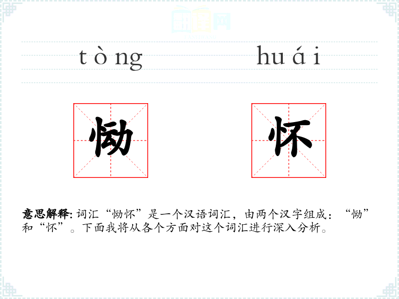 “恸”字最早见于《说文解字》,原意为痛哭。“怀”字则有怀抱、思念之意。两个字组合在一起,形成了表达深切悲痛和怀念的复合词。