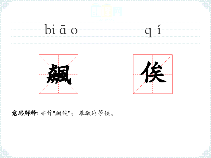 亦作"飆俟"; 恭敬地等候。