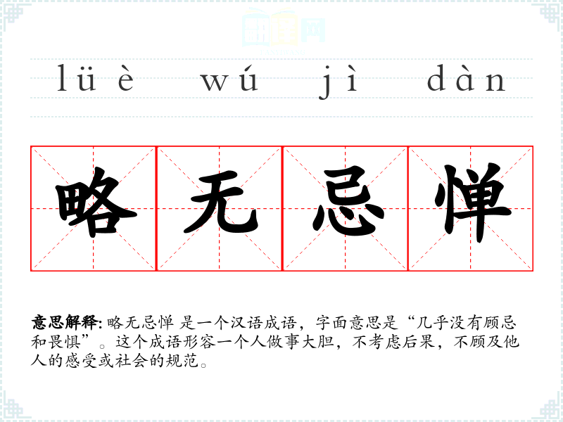 略无忌惮 是一个汉语成语,字面意思是“几乎没有顾忌和畏惧”。这个成语形容一个人做事大胆,不考虑后果,不顾及他人的感受或社会的规范。