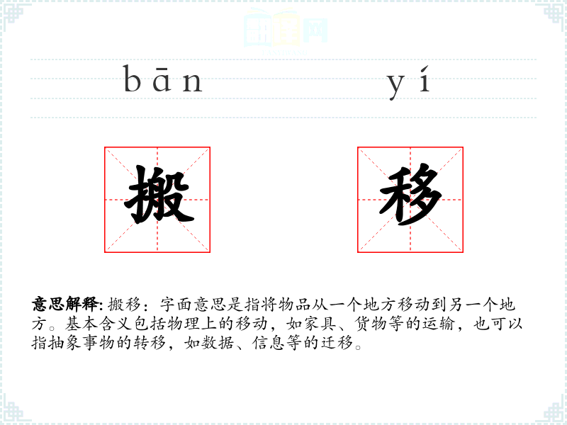 搬移:字面意思是指将物品从一个地方移动到另一个地方。基本含义包括物理上的移动,如家具、货物等的运输,也可以指抽象事物的转移,如数据、信息等的迁移。