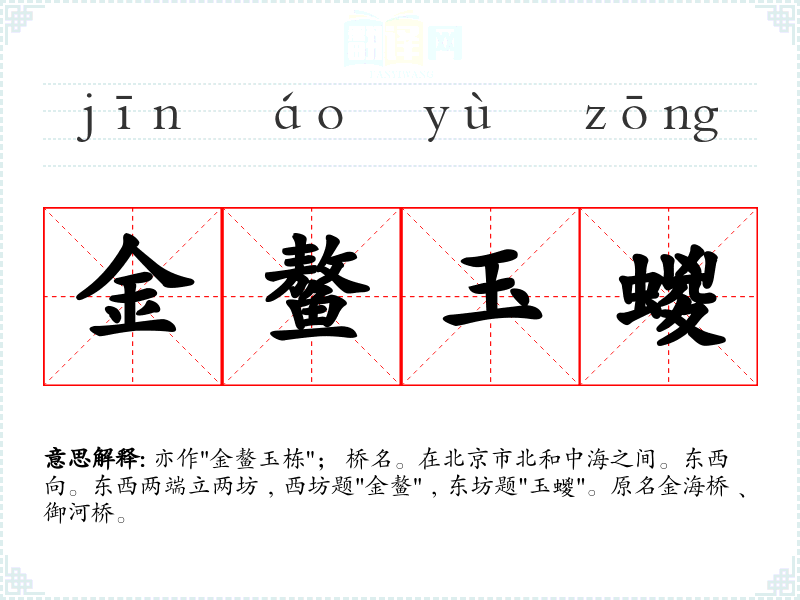 亦作"金鳌玉栋"; 桥名。在北京市北和中海之间。东西向。东西两端立两坊﹐西坊题"金鳌"﹐东坊题"玉蝬"。原名金海桥﹑御河桥。