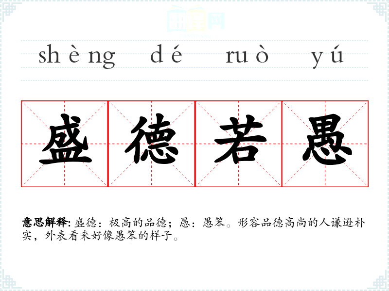 盛德:极高的品德;愚:愚笨。形容品德高尚的人谦逊朴实,外表看来好像愚笨的样子。
