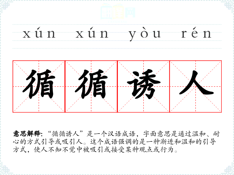 “循循诱人”是一个汉语成语,字面意思是通过温和、耐心的方式引导或吸引人。这个成语强调的是一种渐进和温和的引导方式,使人不知不觉中被吸引或接受某种观点或行为。