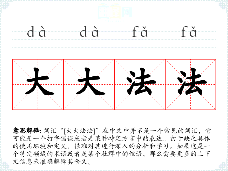 词汇“[大大法法]”在中文中并不是一个常见的词汇,它可能是一个打字错误或者是某种特定方言中的表达。由于缺乏具体的使用环境和定义,很难对其进行深入的分析和学习。如果这是一个特定领域的术语或者是某个社群中的俚语,那么需要更多的上下文信息来准确解释其含义。