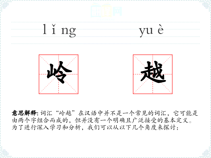 由于“岭越”不是一个标准词汇,我们无法给出一个确切的字面意思和基本含义。但从字面上看,“岭”通常指山岭,而“越”可以表示跨越或超越。因此,“岭越”可能隐含着跨越山岭的意味。