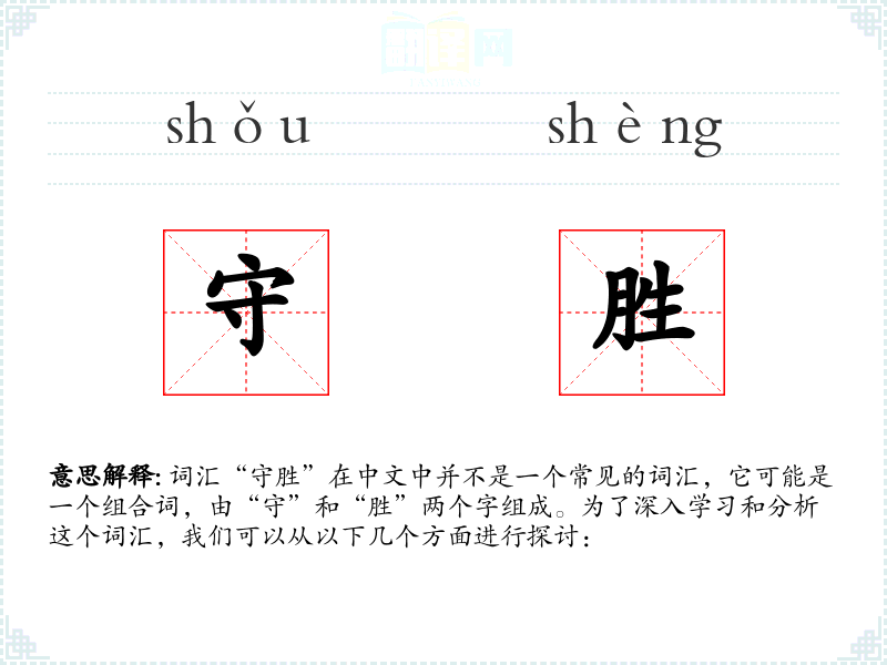 词汇“守胜”在中文中并不是一个常见的词汇,它可能是一个组合词,由“守”和“胜”两个字组成。为了深入学习和分析这个词汇,我们可以从以下几个方面进行探讨:
