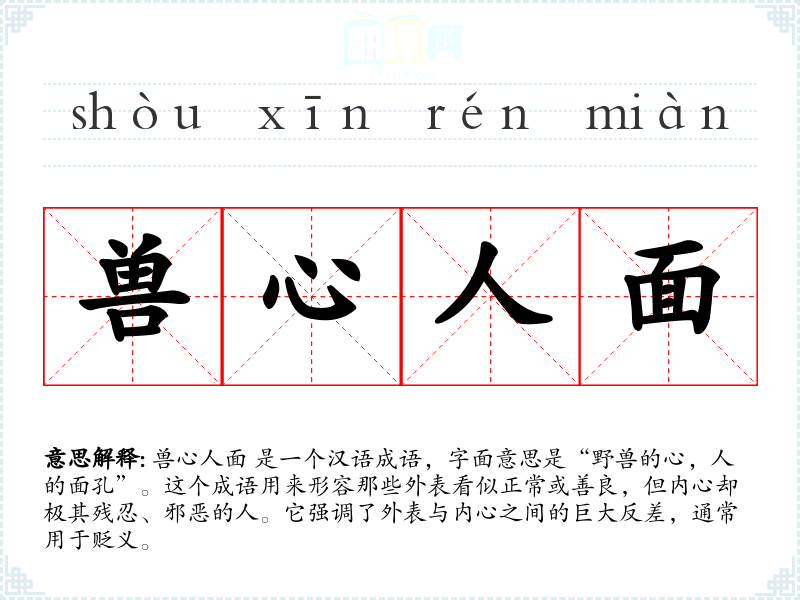 兽心人面 是一个汉语成语,字面意思是“野兽的心,人的面孔”。这个成语用来形容那些外表看似正常或善良,但内心却极其残忍、邪恶的人。它强调了外表与内心之间的巨大反差,通常用于贬义。