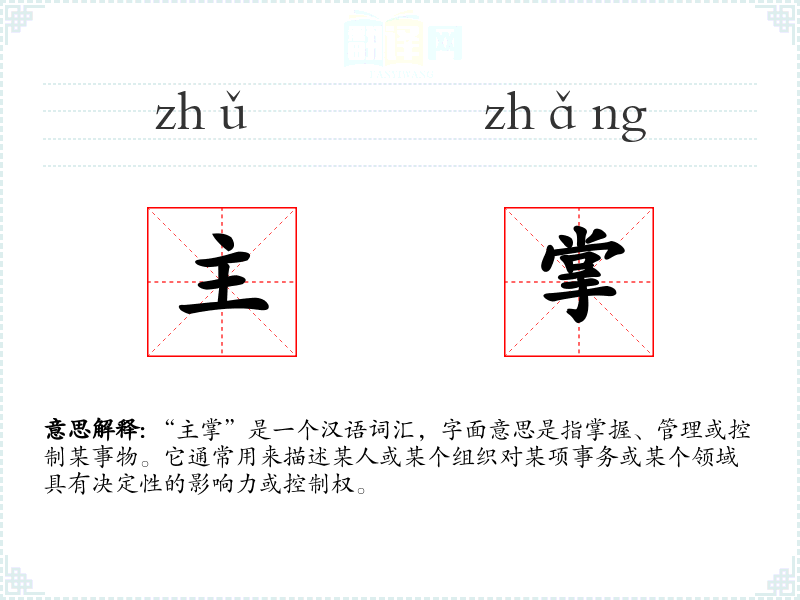 “主掌”是一个汉语词汇,字面意思是指掌握、管理或控制某事物。它通常用来描述某人或某个组织对某项事务或某个领域具有决定性的影响力或控制权。